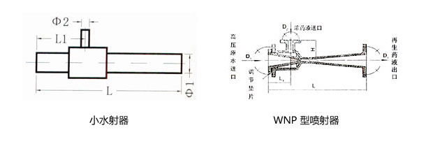 高壓原水通過管道閥門進入噴射器的漸縮段,將靜壓頭轉換成動能,在噴嘴處成為高速射流,使混合室形成微真空狀態(tài),將高濃度的再生藥液吸入混合室,并使再生藥液的壓力和速度發(fā)生變化;在混合段內,水和藥液得到充分地混合,然后注經(jīng)擴散段,使再生液減低流速,靜壓頭升高,再通過出口管道及閥門將稀再生液送到交換器本體中。